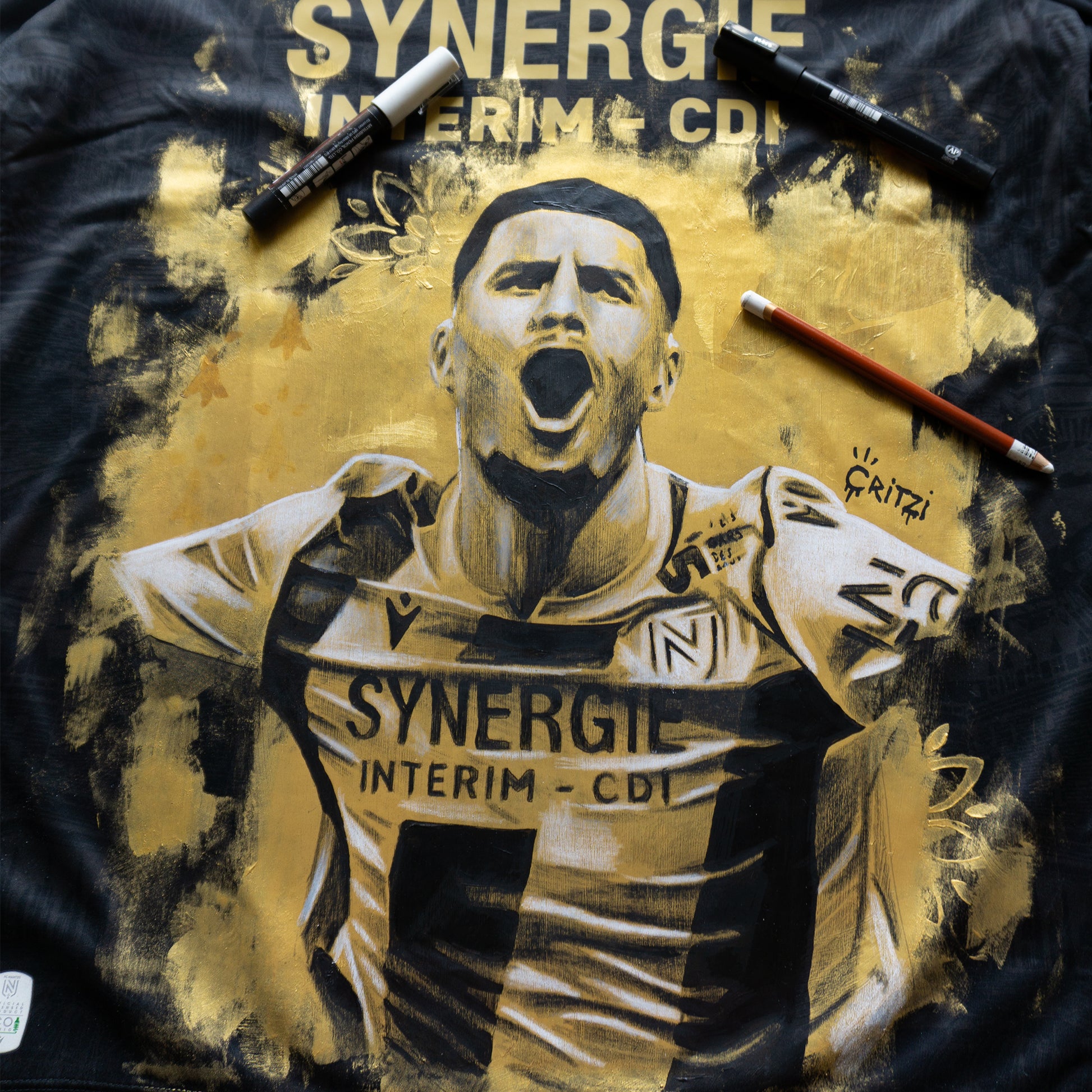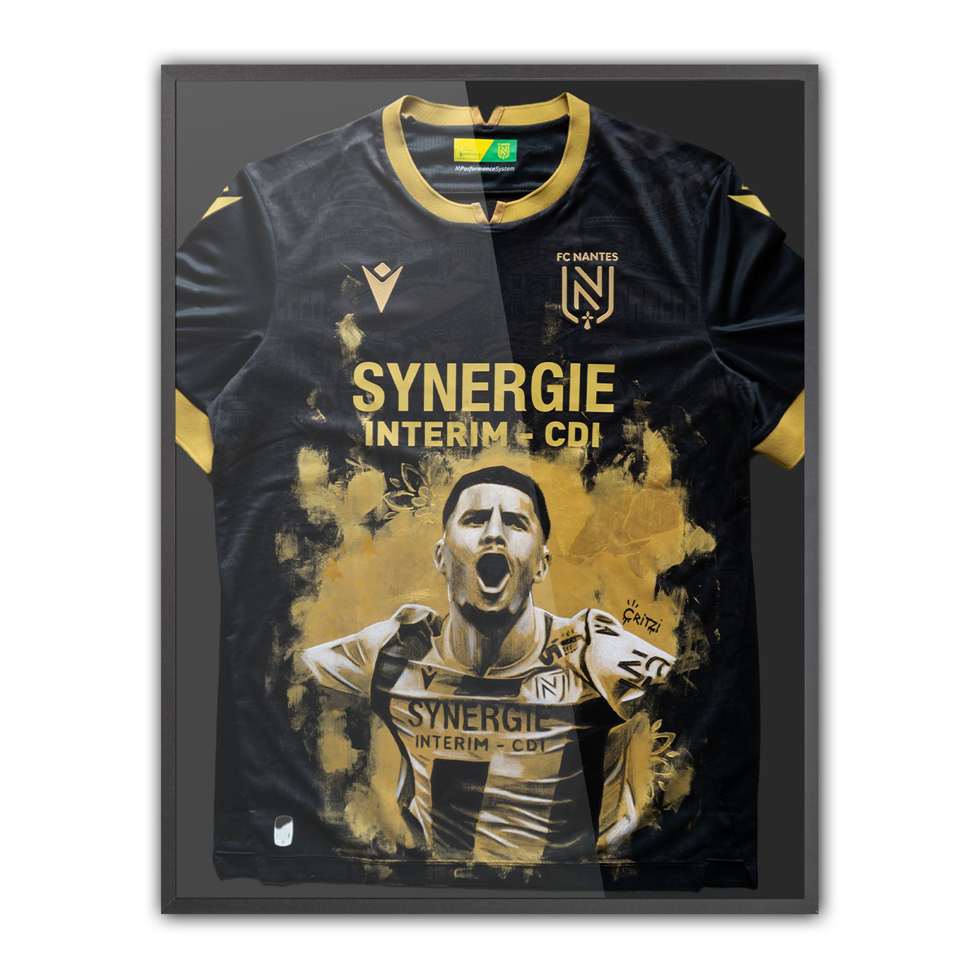 Ce maillot du FC Nantes, édition extérieur 2024-2025, a été entièrement personnalisé à la main avec de la peinture acrylique, des crayons et des marqueurs Posca.