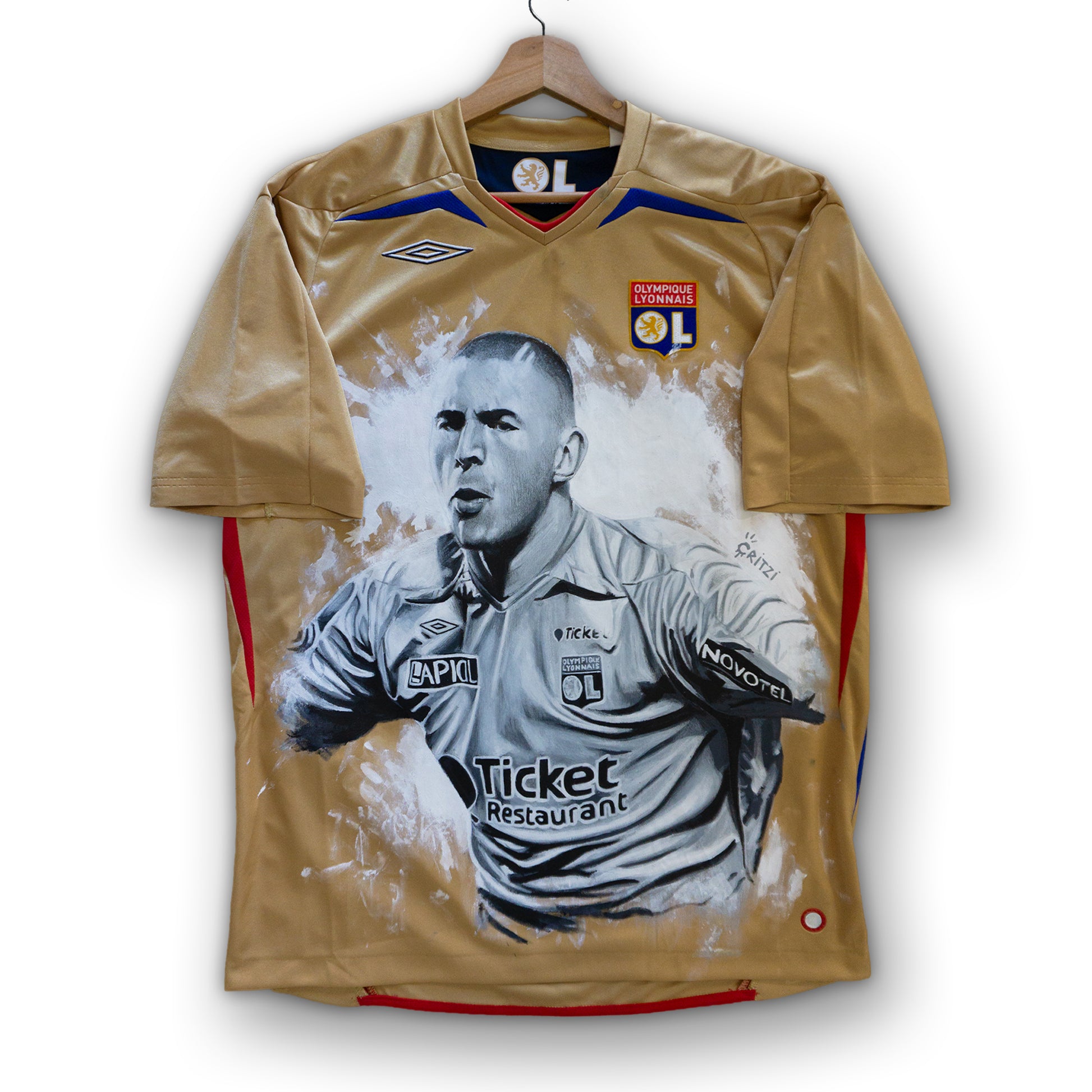 This Olympique Lyonnais third jersey from the 2007–2008 season is already a rare piece on its own. It has then been fully hand-painted using acrylic paint, pencils, and Posca markers.