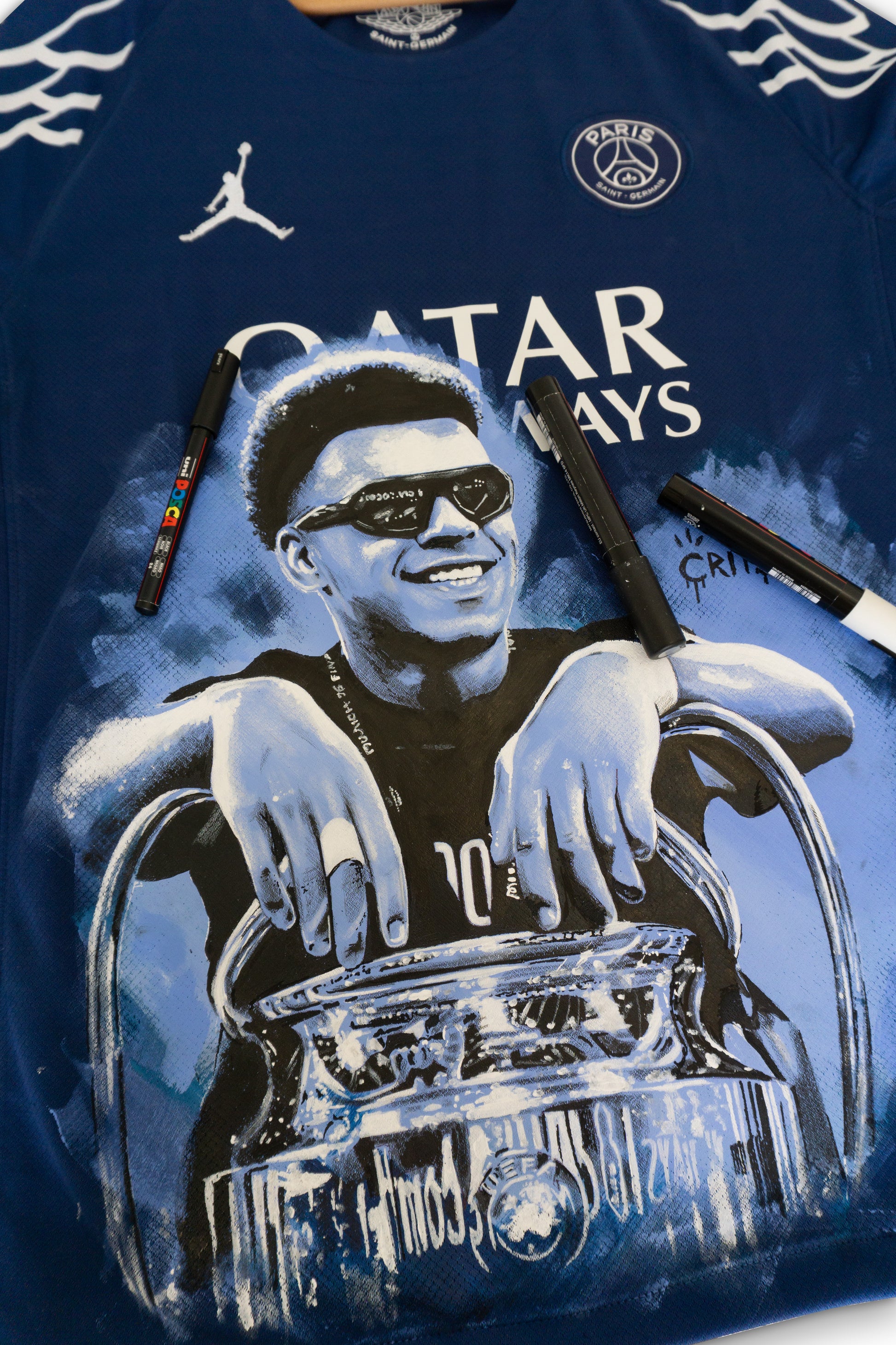 This Jordan jersey worn during the 2025 Champions League has been entirely customized by hand using acrylic paint, pencils, and Posca markers.